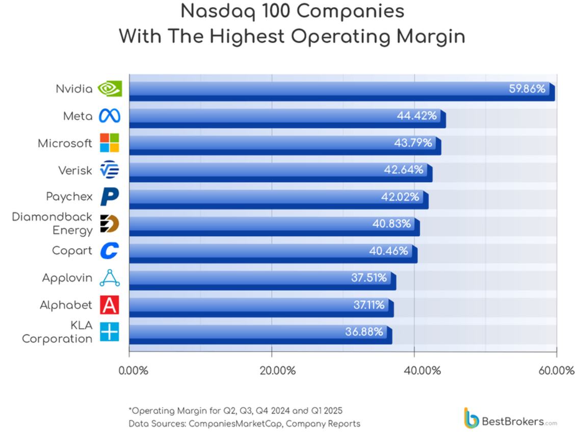 这家市值达4.3万亿美元的全球最具价值公司,凭借在AI和半导体等高利润市场的主导地位展现出卓越运营效率,而特斯拉(TSLA)仅以8.76%的利润率垫底。