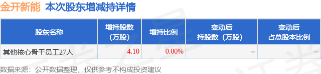 证券之星消息,9月30日金开新能发布公告《金开新能:关于公司部分董事、高级管理人员及其他核心骨干员工自愿增持公司股份计划暨落实“提质增效重回报”行动方案的进展公告》,其股东其他核心骨干员工27人于2025年9月1日至2025年9月30日间合计增持4.1万股,占公司目前总股本的0.0021%,变动期间该股股价下跌1.38%,截止9月30日收盘报5.71元。